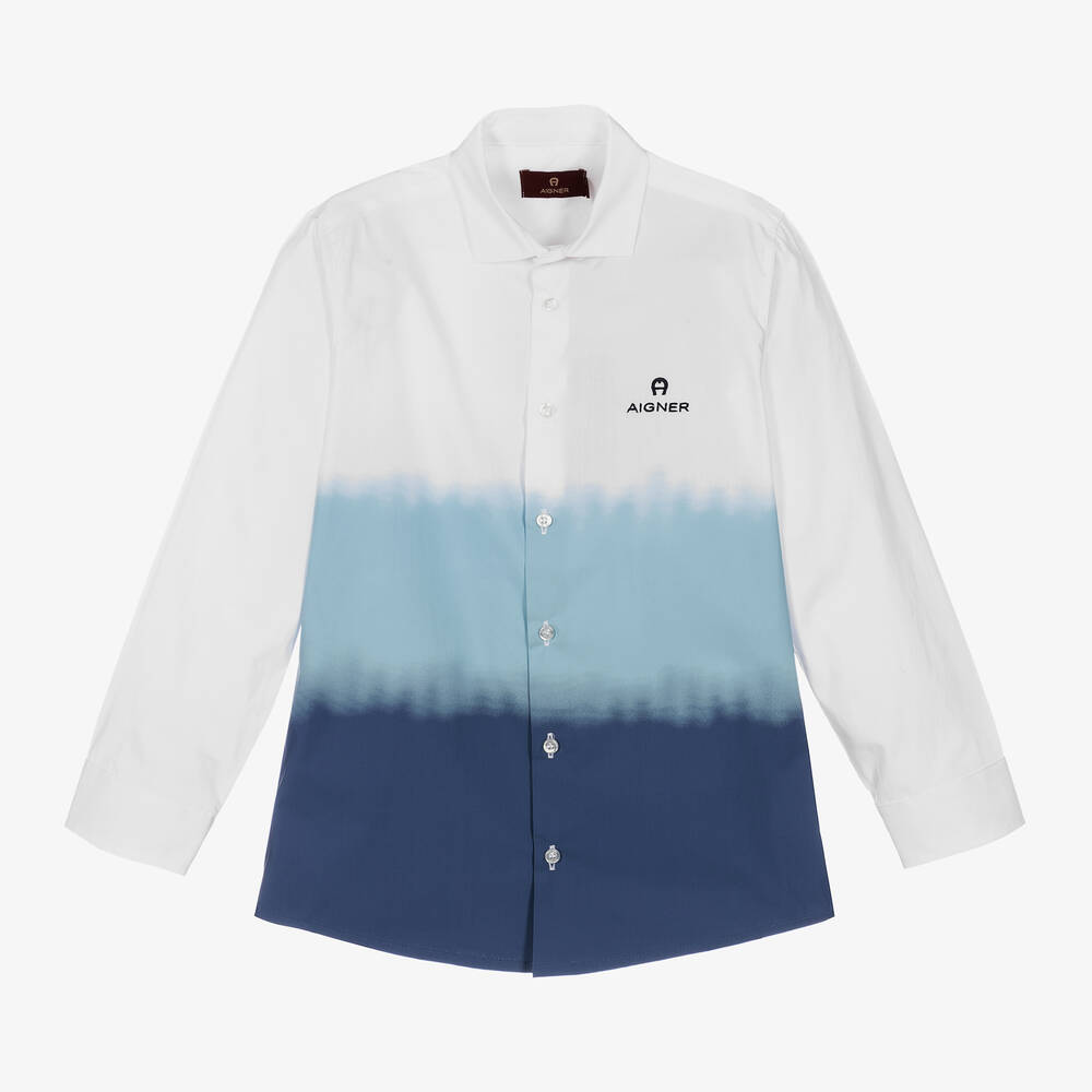 A classic shirt for teen boys by AIGNER, blending from white to dark blue in a modern ombré design. Embroidered with the brand's signature 'A' horseshoe logo, this cotton poplin shirt has a smart pointed collar, front button fastenings and buttoned cuffs.