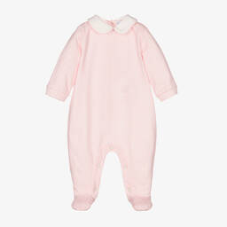 Super cute white and pale pink babygrow for girls by Alviero Martini, with the look of a two piece. It has an adorable embroidered bear and star appliqué on the front, and, unmistakably by the brand, it has the signature Geo map print in pink on the lower part. Made in soft, comfortable jersey, it has a poplin collar.