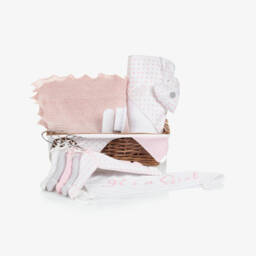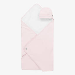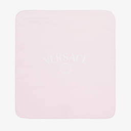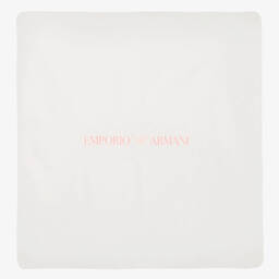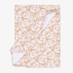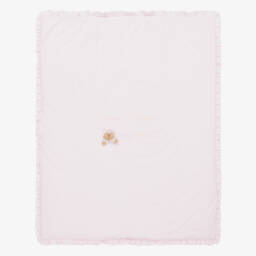 Lovely white blanket for baby girls by Alviero Martini, made in soft cotton jersey. The front is edged in the brand's signature Geo map print in pink and beige. It has a large beige teddy bear face in the centre with a cute Geo map bow and beige '1A Classe' embroidery. This sweet blanket makes an ideal accessory for the nursery or when out and about in the pram or car seat.