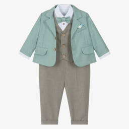 Ideal for a special occasion, this blue suit for younger boys is by Andreeatex. The royal blue velvet tail jacket has decorative gold crest buttons and a colourful satin pocket square to match the tie. The navy blue twill trousers have turn-up cuffs and an elasticated waistband for a comfortable fit. Made in lightweight cotton, the white shirt fastens with buttons and has a wing collar. A black satin top hat with blue velvet trim completes the smart look.