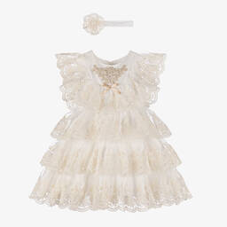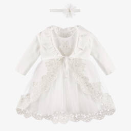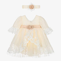 Ivory and pink special occasion dress for little girls from Andreeatex. Decorated with pretty pink lace, the dress has a satin bodice and tulle skirt which is longer at the back. This lovely set comes with a matching headband and an ivory crêpe satin bolero jacket. Smaller sizes come with satin knickers.