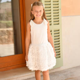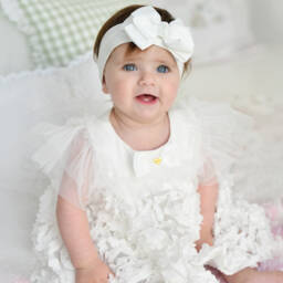 Off-white and pink dress for baby girls by Angel's Face, made in soft tulle with a delicate rose print. Lovely for a special occasion, it has a romantic bow appliqué on the bodice and sweet flutter sleeves. It is lined in soft jersey for comfort against babies' skin and fastens with a neat keyhole button on the back of the neck.