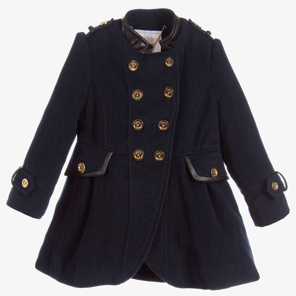 Made in a soft feel wool blend, this smart navy blue coat for girls, is designed by Angel's Face. In a military style, there are shiny gold buttons to fasten, with matching buttons on the cuffs and pocket flaps. It has a gently fitted waist and flare, with a luxurious red satin lining.