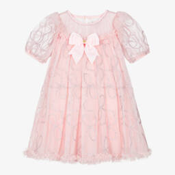 A pretty pink, sleeveless dress for girls by Angel's Face, made in layers of soft rainbow tulle, with ruffle trims. Ideal for a party or special occasion, this voluminous style is lined in soft jersey for comfort. It has narrow straps and a statement ruffled flower on the front.