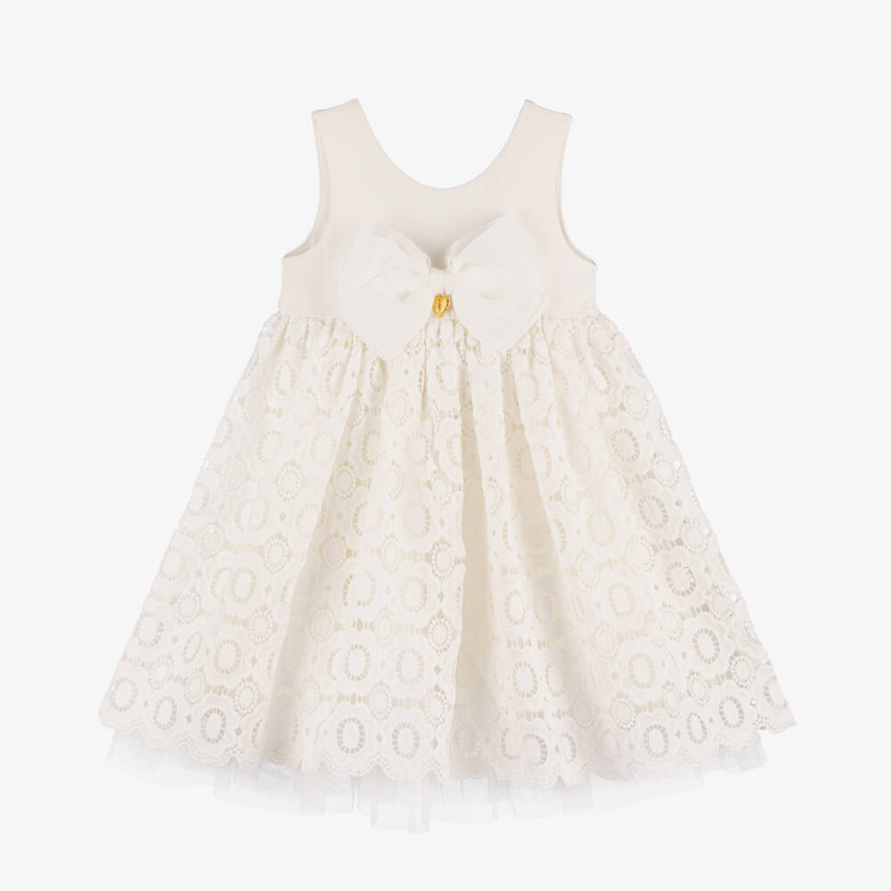 A beautiful off-white, special occasion dress for girls by Angel's Face, with a stunning guipure lace skirt. Combining comfort and style, this easy slip-on, sleeveless design features a cotton jersey bodice with the designer's statement grosgrain bow and gold heart charm on the front. Fully lined for comfort, the skirt has a visible underlayer of tulle for extra volume.