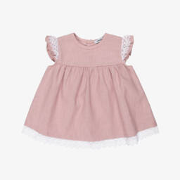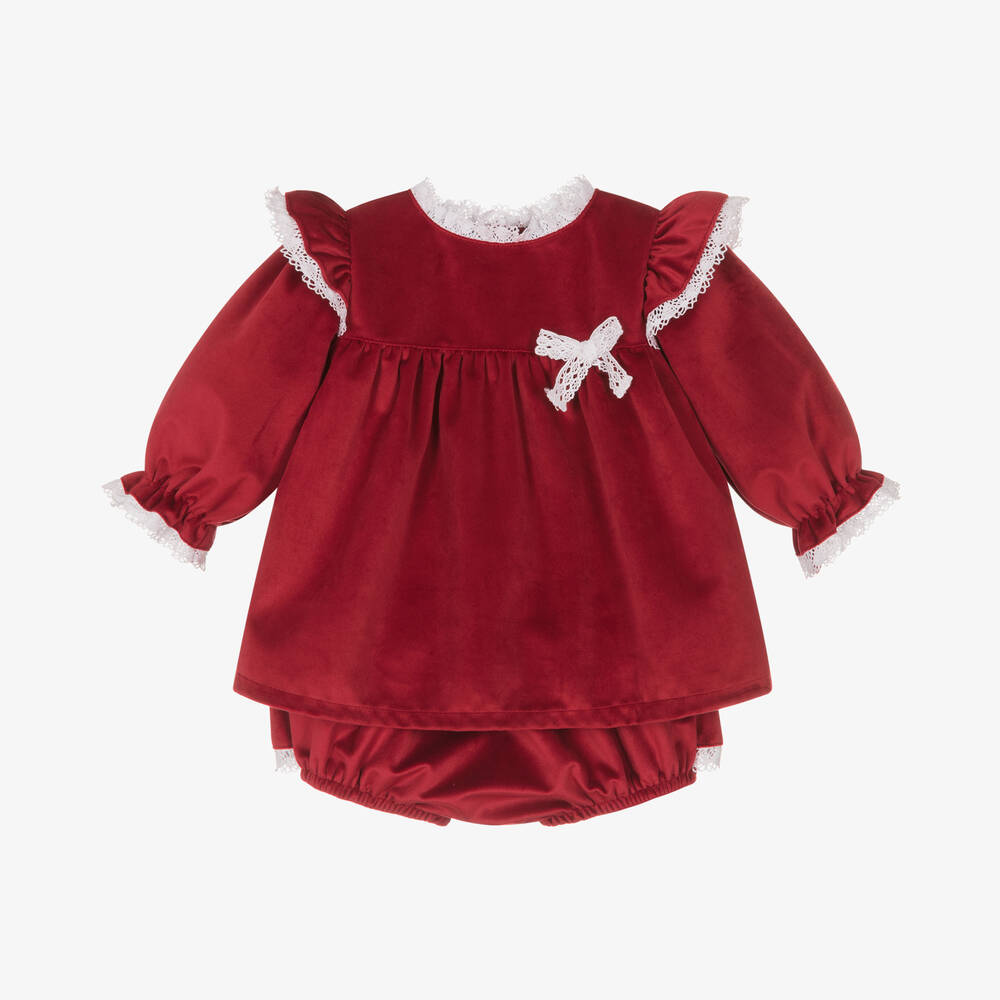 A traditionally-styled red dress for baby girls by Spanish brand Babidu. It has ruffles over the shoulder, with pretty white crochet lace trims. Made in super soft velvet, it has a lightweight voile lining for added comfort, with wooden buttons for fastening on the back. This lovely dress comes with matching knickers to complete the classic look.