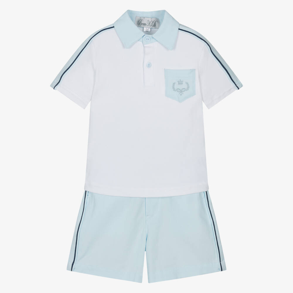 A white and beige shorts set for boys from Beau KiD, made in soft cotton. Cool and lightweight, the shorts are styled with slanted front pockets and faux back pockets. Easy to wear, they simply pull on. The jersey polo shirt has coordinating trims and an embroidered chest pocket to complete the classic look.