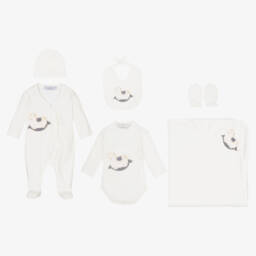 Baby boys ivory three piece babysuit set from Beau KiD. The shortie is made in soft satin, with an attached satin bow tie and button fastenings. The lined waistcoat is made in silky-feel satin, with a paisley pattern and covered button fastenings. It comes with a lined satin hat.