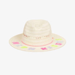 A pale beige straw hat for girls by Billieblush. It has a colourful logo-branded band in shades of pink, lilac, blue and neon green, with pretty fringing trim. For added comfort, this lovely hat has an inner grosgrain band in bright neon pink.