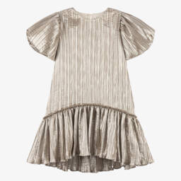 Потрясающее кремовое платье для девочек от Billieblush с элегантными золотыми блестящими бантами на бретелях. Оно красиво переливается на свету и выполнено из мягкого плиссированного крепа с модными закрученными краями. Вырез горловины слегка эластичный, что позволяет легко надевать платье через голову. Внутри мягкая вискозная подкладка для комфорта.