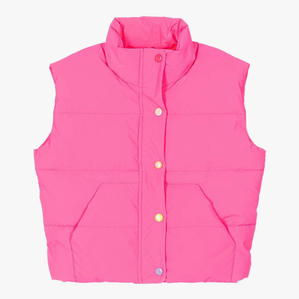 Eye-catching neon pink gilet for girls by Billieblush, ideal for layering. Silky smooth and filled with lightweight padding for added warmth, it has front pockets and a colourful rubberised logo patch on the back for a subtle designer touch. In a cute boxy fit, it fastens with a zip and glittery poppers on the front, and has a silky smooth lining for comfort.