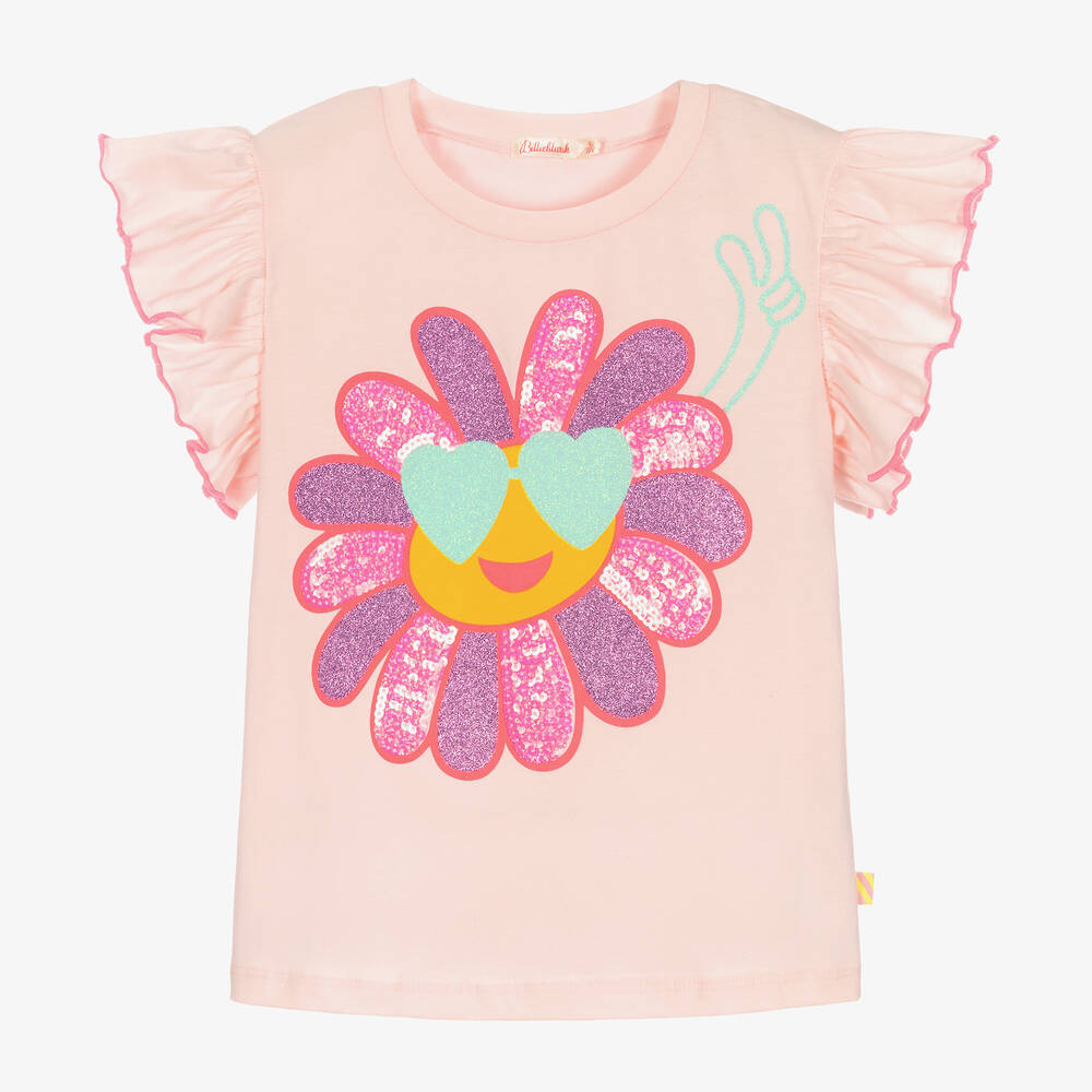 A pale pink T-shirt for girls by Billieblush, made from soft organic cotton jersey. Super fun, it has a bright pink sequinned and purple glittery flower design on the front for a bold look. Casually styled, this relaxed fit top has frilled short sleeves with neon pink edging for an added girly touch.