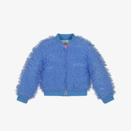 Neon pink denim jacket for girls by Billieblush, with clear disc sequins on the front that catch the light. This timeless style has easy popper fastenings, designed to resemble glittery silver buttons. It has two patch pockets on the front and distressed trims around the cuffs for added detail.