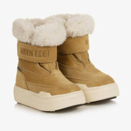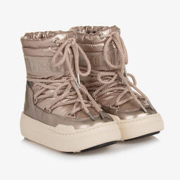 Gold ankle boots for girls by French brand Bonpoint, made in soft and supple leather with a pearlescent sheen. Ideal for casual looks or more formal occasions, these round-toe boots have a curved panel on the front and a zip on the back to help get them on and off. Lined in comfortable leather, they have a gently cushioned insole and a rubber sole with a small tan brown heel.