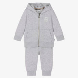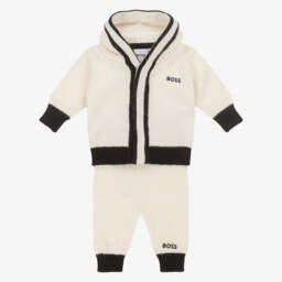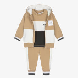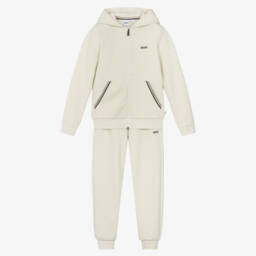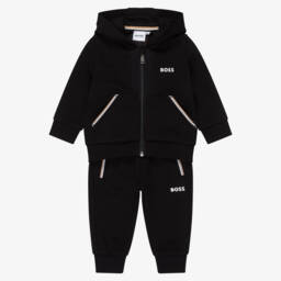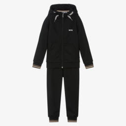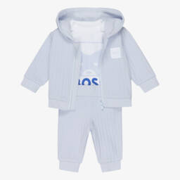 Casual blue tracksuit for little boys by luxury designer BOSS, made in soft and comfortable jersey. Iconic and innovative, the zip-up hoodie has striped, ribbed detailing on the front, combined with the instantly recognisable brand logo. The coordinating joggers have a drawstring waist with a matching white logo on the leg.