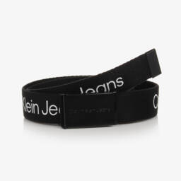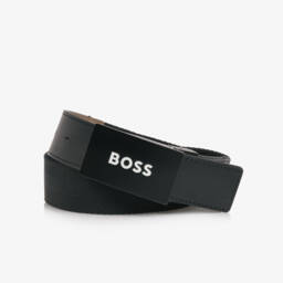 A sleek black leather belt for teen boys from BOSS, fastening with a matte silver buckle. This cool design is embossed with subtle monogram branding and detailed with a white logo print on the front loop.