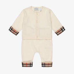 A delightful pale blue trouser set for baby boys and girls by luxury brand Burberry, made from a soft cashmere knit. Elegantly designed, the adorable buttoned cardigan has a subtle TB monogram on the back, cable knit detailing on the sleeves, and ribbed trims. The matching trousers have a comfortable elasticated waist with a faux drawstring and the cute pointed bonnet ties neatly under the chin. A beautiful present, this set comes in a lovely gift box.