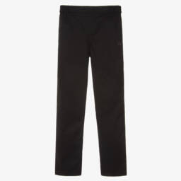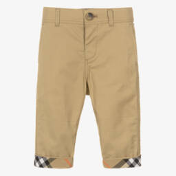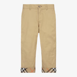 Archive beige trousers for boys by British luxury brand Burberry. Made from soft cotton twill, these smart-casual chinos are embroidered with the distinguished Equestrian Knight Design on one leg for a heritage touch. They have side slip pockets, back pockets, and a stretchy, elasticated waist. They fasten neatly on the front with a concealed hook and zip closure.