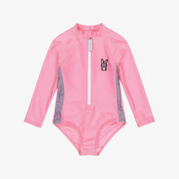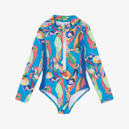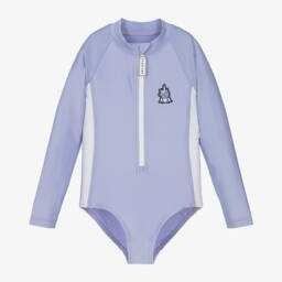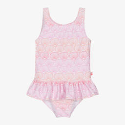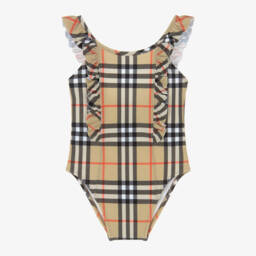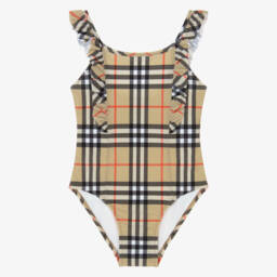 Beige swimming costume for girls by luxury brand Burberry, in the designer's signature beige check with black and orange. Soft, silky and fully lined for comfort, it has a stylish asymmetric ruffle around the shoulders.