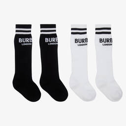 Pack of two beautifully soft ivory socks for baby boys and girls by luxury label, Burberry. Made in a gentle cotton blend for comfort on tiny toes, each pair of these neutral socks features the iconic Oversized check on the ankle for a branded touch.