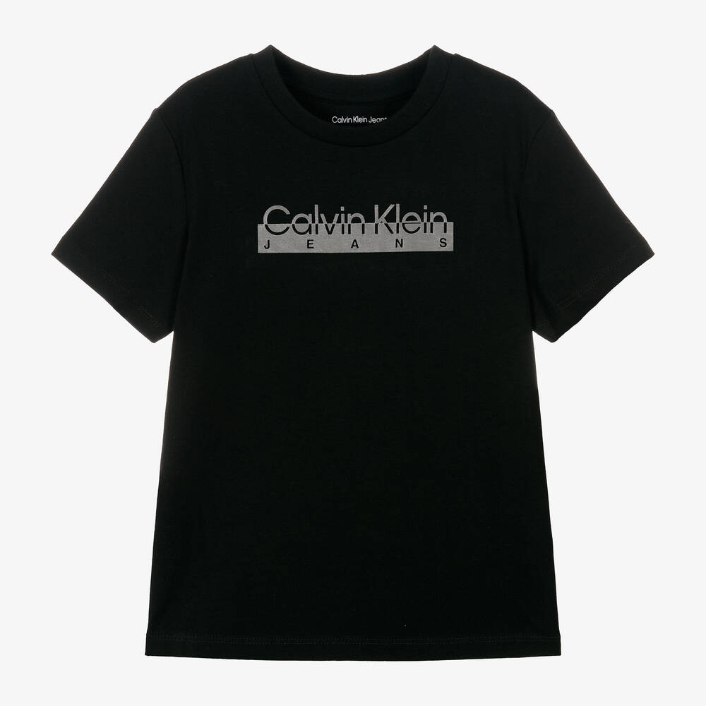 From Calvin Klein, a black cotton T-shirt for little boys and girls. Made in soft and comfortable jersey, this casual top is given a stylish touch with the addition of a silver logo print across the front.