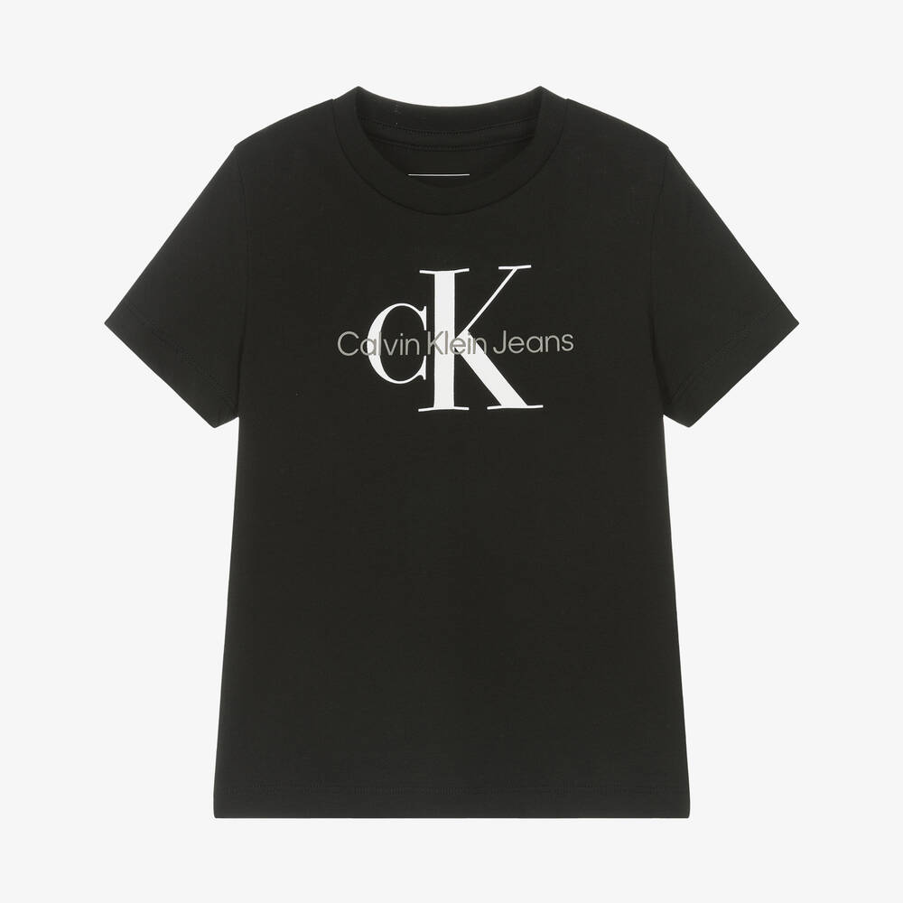 A black T-shirt for boys, with a textured Calvin Klein monogram printed in white and grey on the front for a statement look. This casual staple is made in soft organic cotton jersey for everyday comfort.