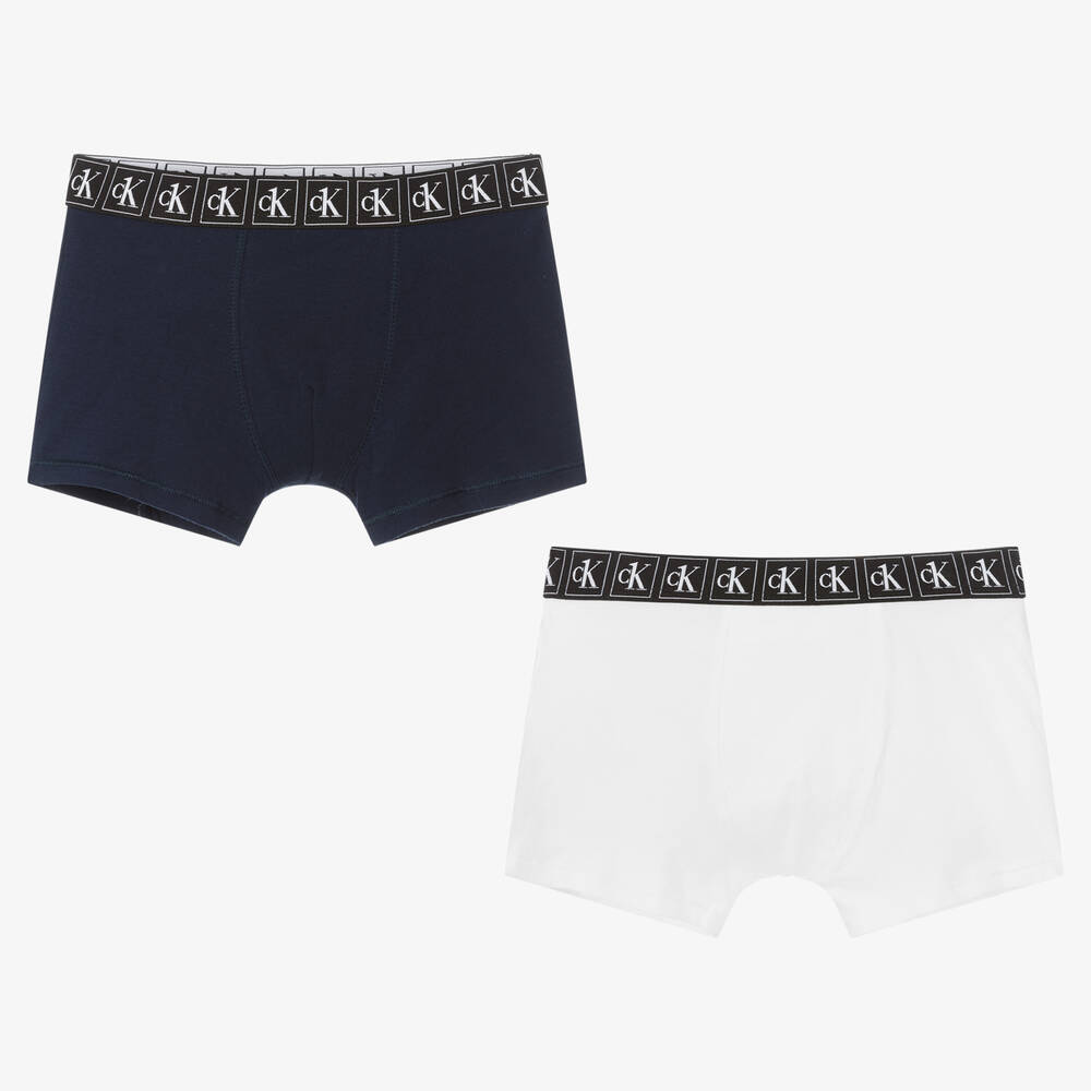 Pack of two pairs of boxer shorts for boys by Calvin Klein, in navy blue and white. They are made in soft, comfortable cotton jersey, with repeat white monogram logo branding on the black elasticated waistband.