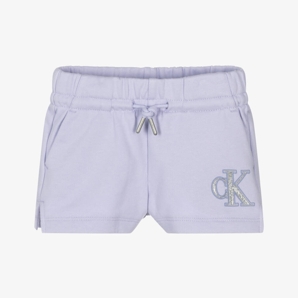 Girls lilac purple cotton shorts by Calvin Klein, with an eye-catching, glittery silver monogram logo on one side. Endlessly comfortable, they are made in soft, sweatshirt jersey with an elasticated waist and a drawstring for an ideal fit. They have useful front pockets and side seam vents giving a sporty look. This product contains at least 95% organic cotton.