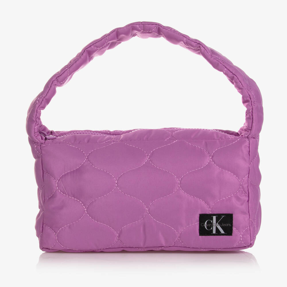 Girls purple quilted shoulder bag by Calvin Klein Jeans. The soft fabric is coloured in the designer's Iris Orchid shade of purple, for a on-trend burst of vibrant colour. There is a zip across the top and a CK logo tag stitched at the base. There is a black fabric-lined interior with a logo tag.