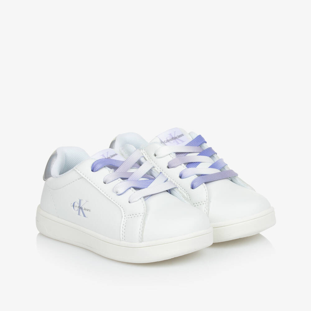 Girls white faux leather trainers by Calvin Klein, with a metallic silver trim on the heel. Casual and comfortable, they are lined in lightly cushioned mesh, with a non-slip rubber outer sole providing good grip. There is an easy-to-use side zip fastening and purple ombré laces, with a matching purple monogram logo for designer appeal.