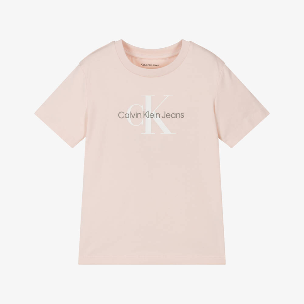 Pale pink cotton T-shirt for boys and girls by Calvin Klein, with a large white and grey monogram logo on the front for a designer finish to this casual piece. It is made in soft, comfortable jersey.