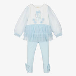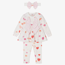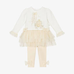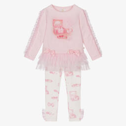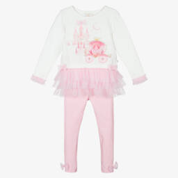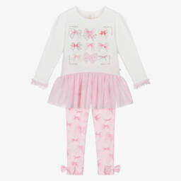 Pretty white and pink leggings set for girls by Caramelo Kids, made in soft jersey. The top has lovely layered tulle sleeves and a tiered tulle hem. The front features a sweet hot air balloon design with pink tulle bows, sparkly diamanté and pearl beads. The full length leggings have matching tulle trims around the ankles and an elasticated waistband for comfortable wear.