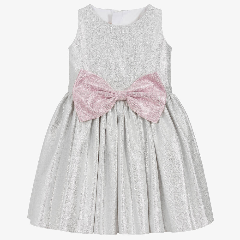 In glittery metallic silver, this Childrensalon Occasions dress for girls has a large removable pink bow on the waistline, secured with poppers. It has a full gathered skirt with a layer of soft tulle below for extra volume and is fully lined in cotton for comfort.