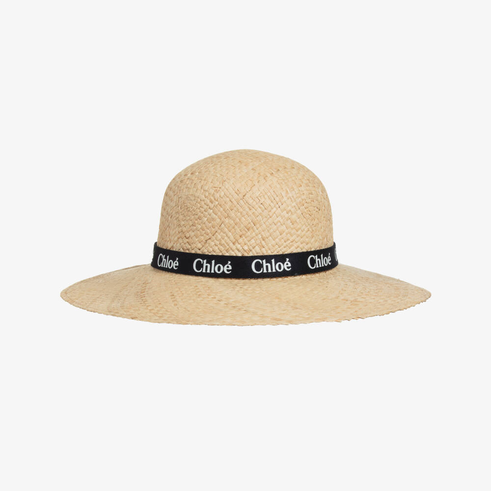 Beige straw hat for girls by French brand Chloé, with a black and white branded ribbon around the crown. Stylish for the beach or poolside, it has a wide brim to help shield from the sun.