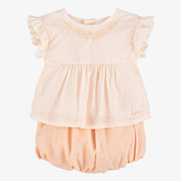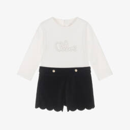 A lovely off-white shorts set for girls by luxury label Chloé, finely knitted with a delicate scalloped pattern in organic cotton. Beautiful for warmer days, this casual outfit is comfortably lined in soft jersey, with neat ribbed trims. Both pieces are signed with a small, gold-tone metal logo for a signature finish.