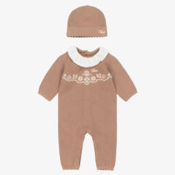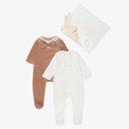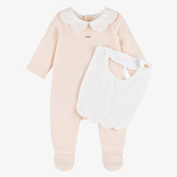 A delightful white babysuit set for girls by luxury French designer Chloé, made in soft organic cotton jersey. A lovely gift for a special little one, it comes beautifully presented in a branded box. The classically styled babygrow has a charming ruffle collar and popper fastenings on the back for easy dressing. It comes with a matching hat with a cute turn-up brim and a useful bib, with a scalloped edge and soft towelling lining. All pieces have delicate floral and logo embroidery in tonal thread for a subtle designer touch.