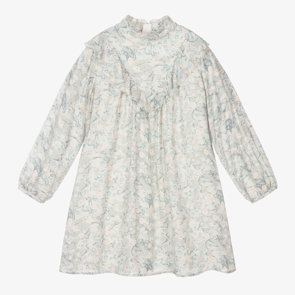 As seen in the main collection, beautiful grey dress for teen girls by luxury French designer Chloé. With feminine ruffles on the bodice, this high-neck dress has a girly pale grey and pink floral print, and is woven in a soft wool and viscose blend.