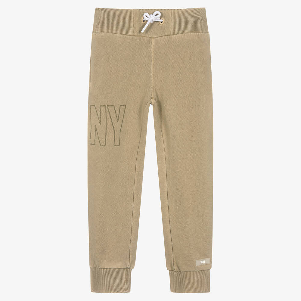 Beige cotton joggers for boys and girls by DKNY. Great for laidback days, they are made in soft sweatshirt jersey and have a drawstring waist with logo ties for a good fit. A tonal logo can be found wrapped around one leg for an edgy, branded look, and there is a white, rubberised logo on one ankle.