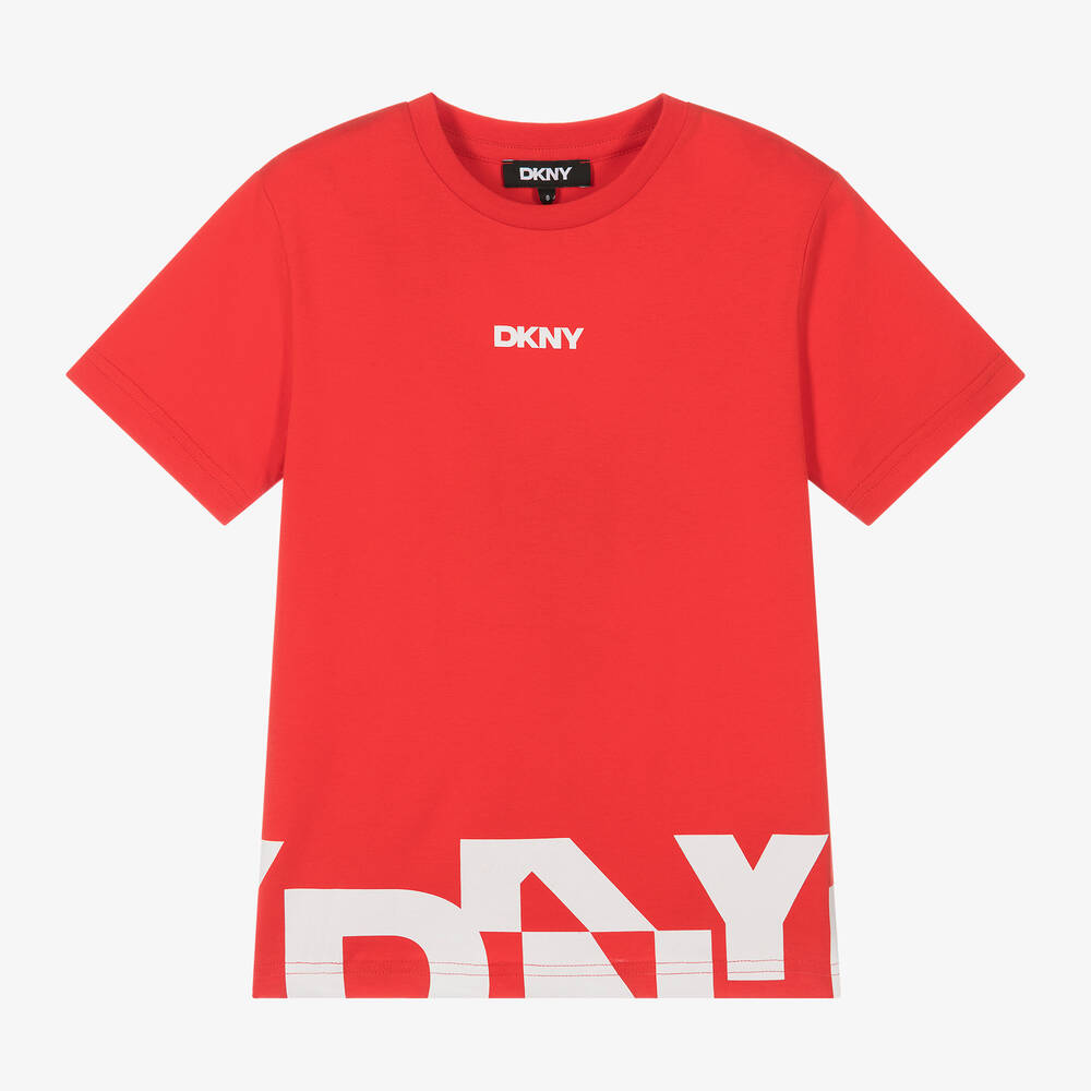 Модная красная футболка из органического хлопка для мальчиков от DKNY. Мягкая и удобная, она украшена смелым укороченным логотипом белого цвета по краю и меньшим логотипом на груди.