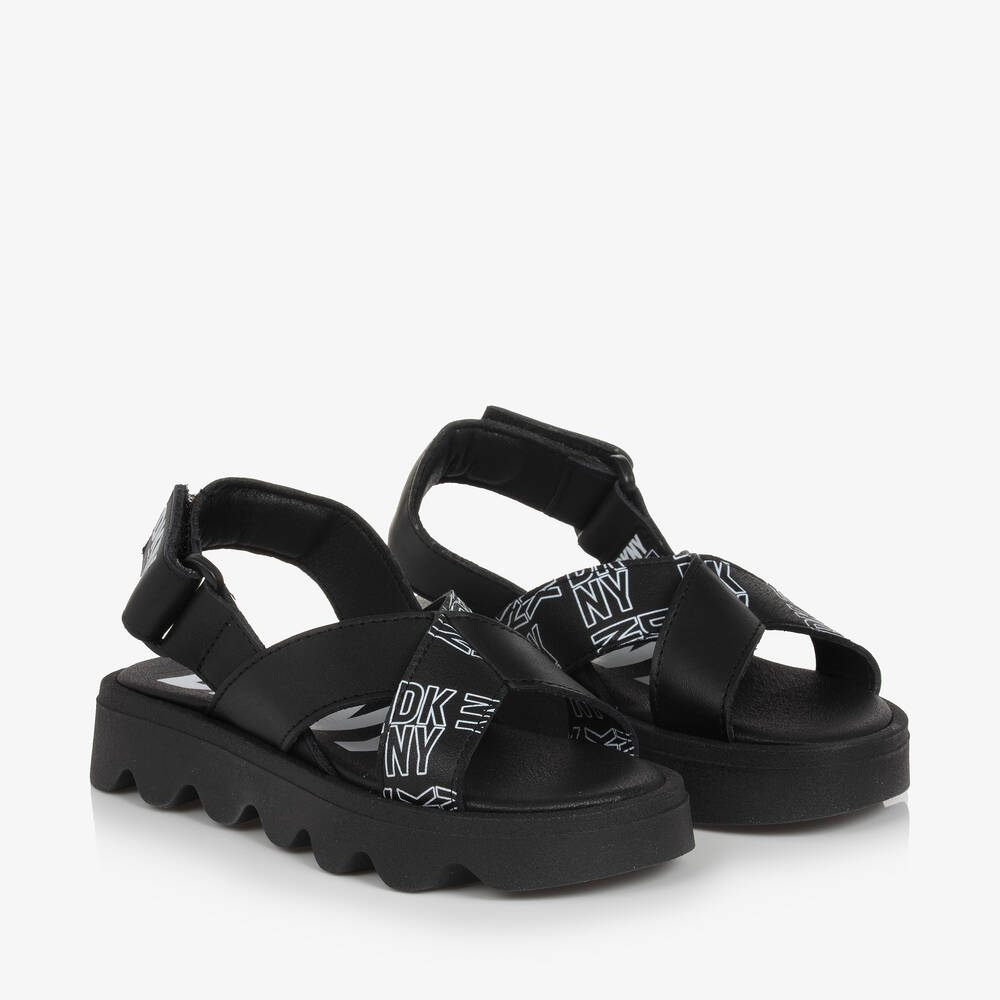 Stylish black sandals for girls by DKNY, made in soft and supple leather. This modern design has cross-over straps stamped with the brand's logo in white for a distinctive look. A lightly cushioned footbed provides all-day comfort and for a great fit, they have a padded, velcro fastening ankle strap. Chunky, non-slip rubber outer soles complete the cool look.