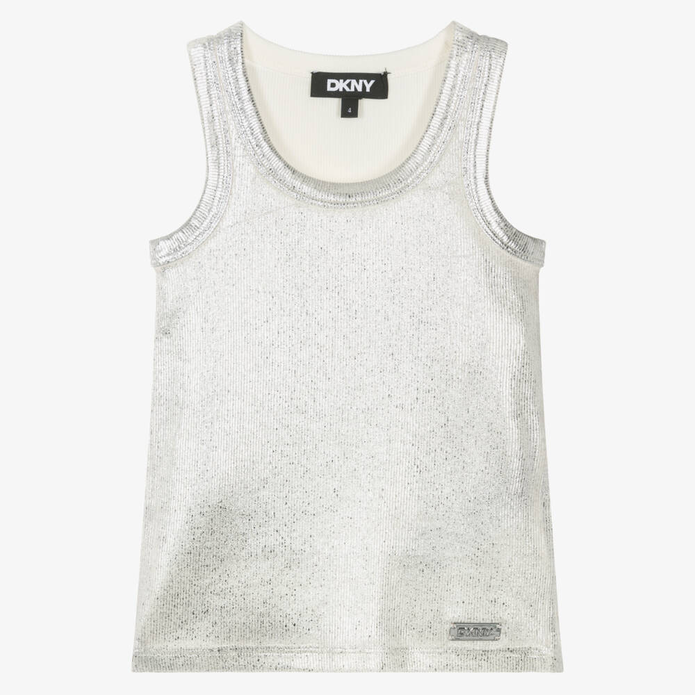 Эффектная майка от DKNY с блестящими серебряными полосками спереди. Изготовлена из мягкого, эластичного, ребристого трикотажа, идеально подходит для добавления нотки гламура и комфорта в любой наряд. Серебряная металлическая табличка с логотипом пришита к подолу для ненавязчивого дизайнерского акцента.