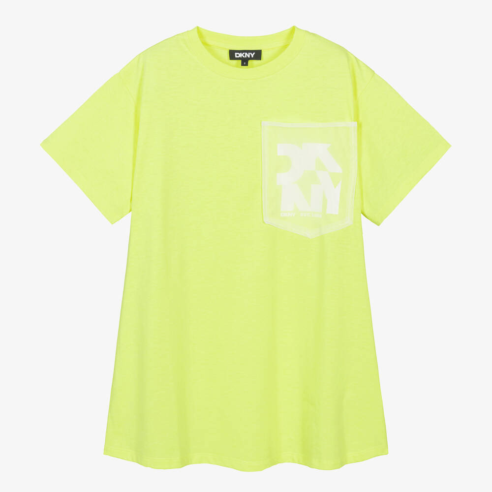 Яркое платье для девочек от американского бренда DKNY в неоново-желтом цвете. Изготовлено из мягкого трикотажного материала с добавлением хлопка, имеет свободный крой и легкую А-образную форму. Прозрачный карман из органзы на груди придает стильный акцент, а белый логотип под ним завершает образ с фирменным дизайнерским штрихом.