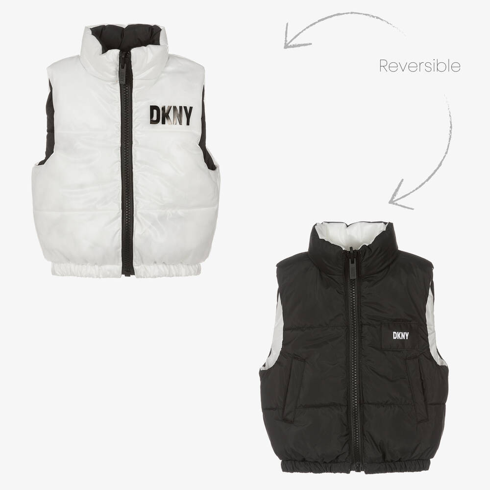 A stylish reversible puffer gilet for girls by DKNY. The white side is transparent, exposing the soft warm padding. It has a black logo print on the chest and a 'Make it Yours' slogan on the back. The black side has a white logo badge on the chest and useful front pockets. This cool sleeveless jacket fastens with a chunky exposed zip on the front and has an elasticated waist for a snug fit.
