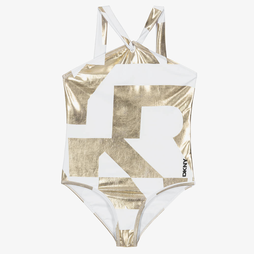 White and metallic gold swimsuit for girls by DKNY, inspired by the adult collection. Silky smooth to the touch, this one-piece has an oversized logo print for a branded look. It has narrow shoulder straps and a twisted neckline for added style.