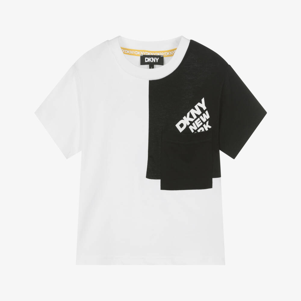 White organic cotton T-shirt for boys and girls by DKNY, with a black colourblock design. In a comfortable relaxed fit, this soft jersey top is casually styled with a crew neckline and chest patch pocket. A contrasting logo print adds instant designer appeal.
