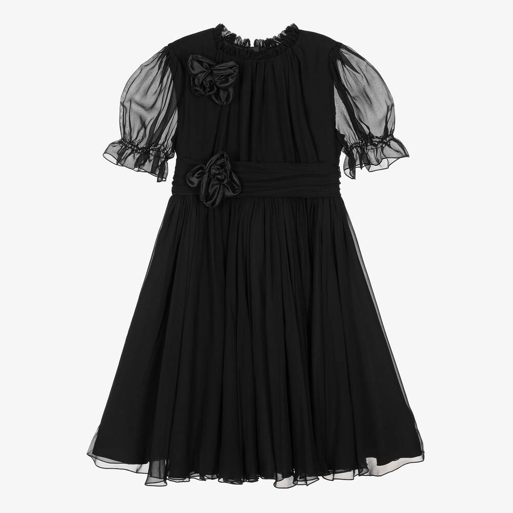 An elegant black dress for older girls by luxury Italian brand Dolce & Gabbana, inspired by the adult's collection. Lovely for a special occasion, this fully lined dress is made in beautifully soft silk chiffon with pretty satin flowers appliquéd on the front. It has a round neckline with a ruffled trim and short, sheer sleeves that are gently elasticated on the arm. The bodice is lightly gathered and the full, flowing skirt adds movement. The sash belt on the waist defines the feminine A-line shape, and the zip fastening on the back is neatly concealed.