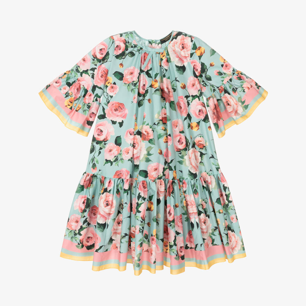 So beautiful for girls, an aqua green dress from luxury Italian label Dolce & Gabbana, patterned with pink, green and yellow florals. Made in comfortable, lightweight poplin, the dress is gathered from the neckline to create a flared silhouette with a deep ruffled hem. A bow appliqué adds a sweet detail on the neckline and the dress fastens with a concealed zip on the back.