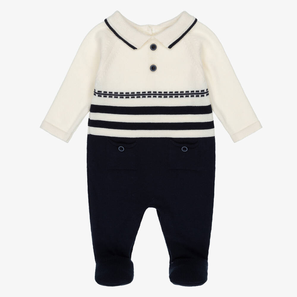 Ivory and navy blue babygrow for baby boys by Dr. Kid. Knitted in soft cotton, this cute one-piece has nautical-inspired stripes and decorative buttons. There are button fastenings on the back and easy-to-use poppers between the legs.