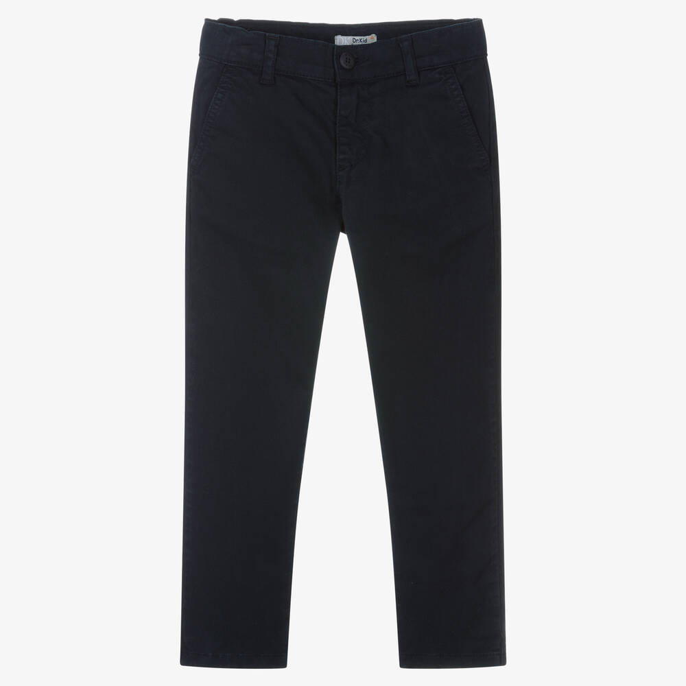 Smart-casual navy blue trousers for boys by Dr. Kid, made in super soft and stretchy cotton. Easy-to-wear, they have three-pocket styling, and a zip and button fastening. A tonal DK logo is embroidered on the back, and there is an adjustable waistband for a comfortable fit.