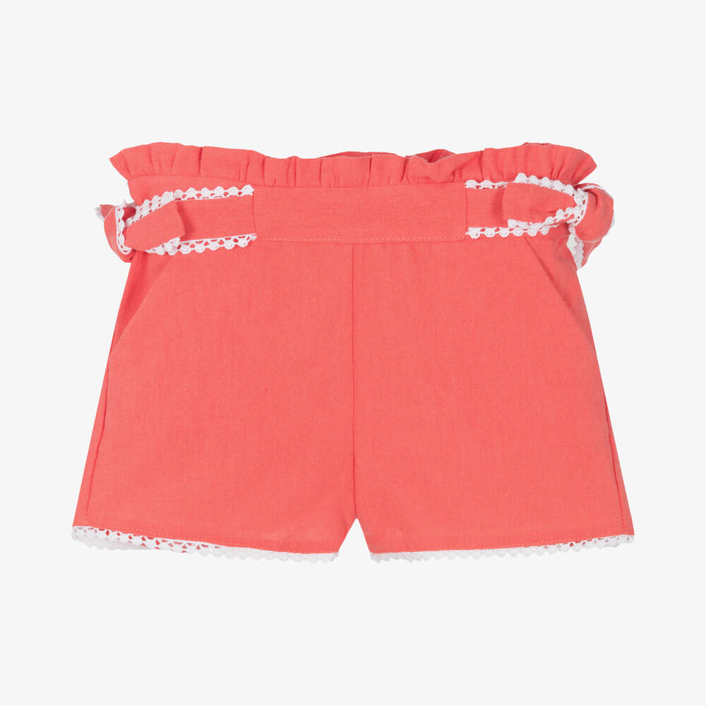 Coral red shorts for younger girls by Dr. Kid, made in a lightweight linen and cotton blend for the warmer months. Easy to pull on, these comfortable shorts have a ruffled waistline with straps that tie into bows on both sides. They have an adjustable waist to easily alter the fit. There are white crochet lace trims on the hem and side straps for a girly, decorative finish.